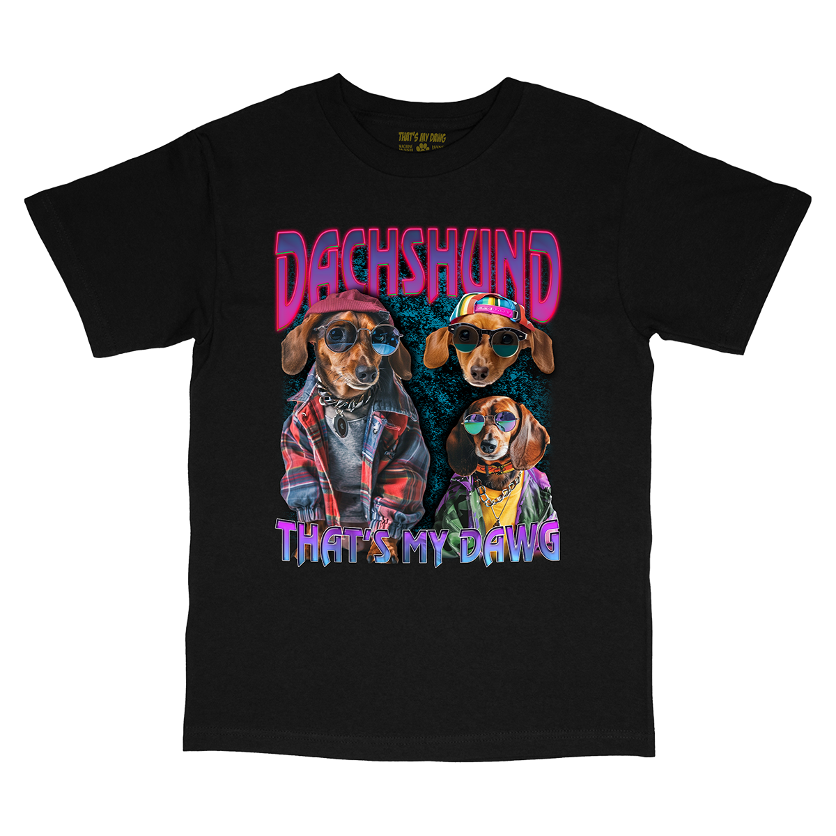 Step into nostalgia and dog-lover's paradise with our 90s Style Dachshund T-Shirt from That's My Dawg Brand. This vintage hip hop-inspired tee captures the essence of 90s fashion with a vibrant Dachshund design, perfect for dog moms, dog dads, and pet parents who love hip hop and/or retro vibes. Available in T-shirt, Long Sleeve, Crewneck Sweater, and various Hoodie styles, each garment is crafted for comfort and durability, ensuring a soft feel and lasting quality/print. Ideal for any Dachshund lover, dog lover or hip hop fan seeking unique apparel like rap T's and bootleg rap pet shirts. Celebrate your love for dogs, hip-hop, and 90s style fashion effortlessly with our exclusive collection. Order your personalized pet tee today and showcase your love for dogs in a one-of-a-kind fashion statement!